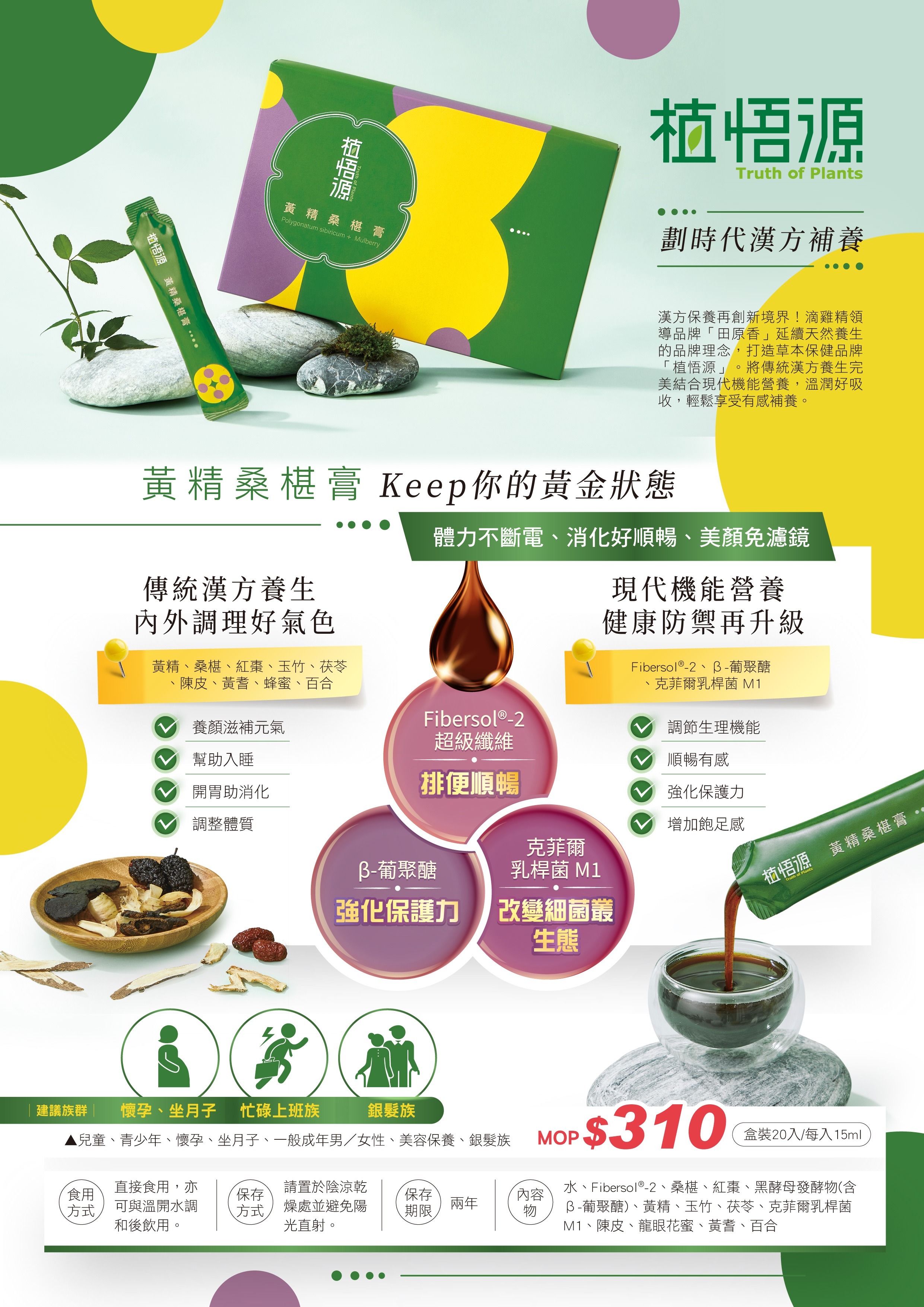 黃精桑椹膏:水、Fibersol-2、桑椹、紅棗、黑酵母發酵物(含β-葡聚醣)、黃精、玉竹、茯苓、克菲爾乳桿菌M1、陳皮、龍眼花蜜、黃耆、百合